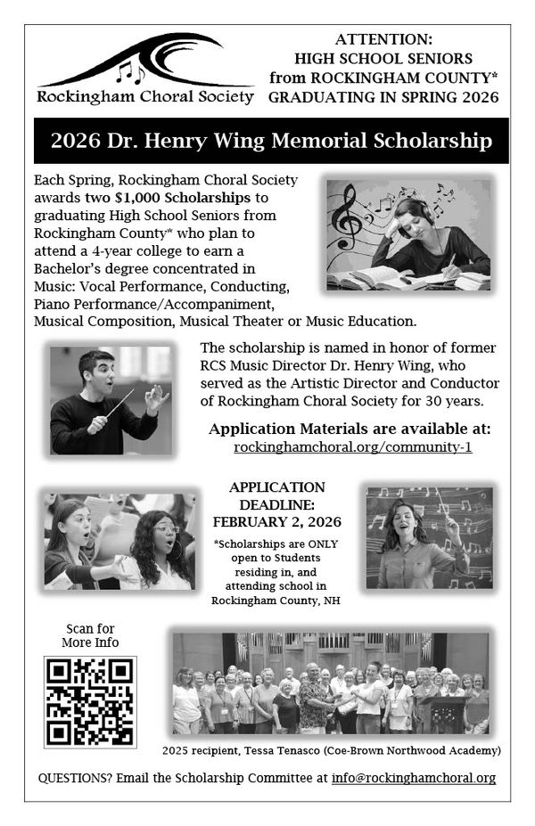 The scholarship is named in honor of former music director Dr. Henry Wing, who served as the Artistic Director and conductor of the choral society for 30 years. Among his many achievements, he instituted a policy of choosing the vocal soloists from the membership and hiring the best orchestral players from Massachusetts, New Hampshire and Maine, including faculty and students from the UNH Music Department. click to download the application packet. Click this to download the letter of recommendation form