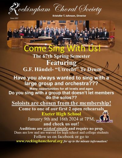 Since 1957, the Rockingham Choral Society has expanded and enhanced cultural experiences by performing choral masterpieces and adhering to the highest musical standards. The Choral Society is comprised of over 100 members and presents two concerts annually to the audiences in the New Hampshire Seacoast region.