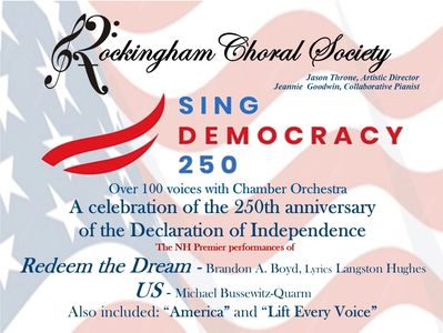 “Sing Democracy 250,” will commemorate the nation’s anniversary with a program of works by American composers. The concert showcases two major works in their New Hampshire premieres—Us by Michael Bussewitz-Quarm and Redeem the Dream by Brandon A. Boyd, accompanied by a chamber orchestra.